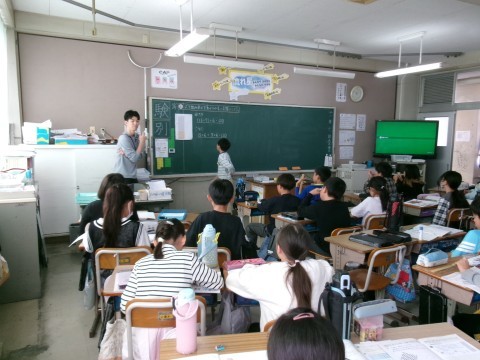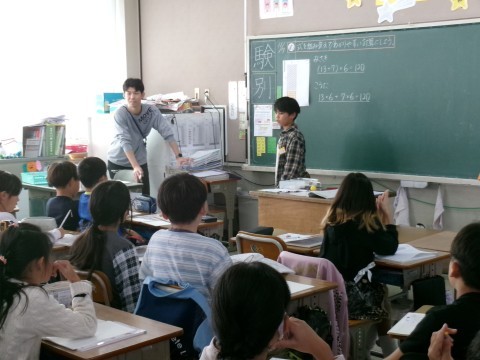 「式を組みかえて,分かりやすい計算にしよう」というめあてで学習を進めていました。13×6+7×6のような問題です。13×6と7×6を表す〇印を並べて,この式が(13+7)×6と同じ答えになり,暗算でも計算できることが分かりました。