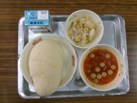今日のメニューは,オリーブパン,ミネストローネ,ツナとポテトのマヨネーズ風味焼きでした。