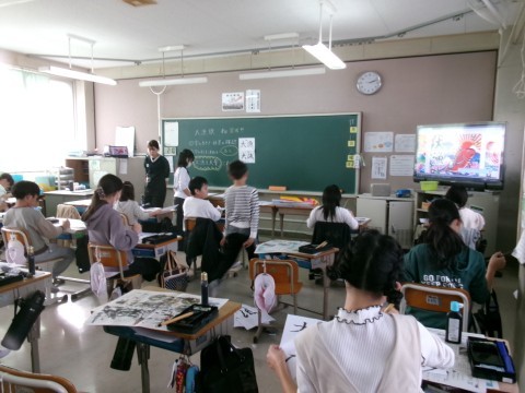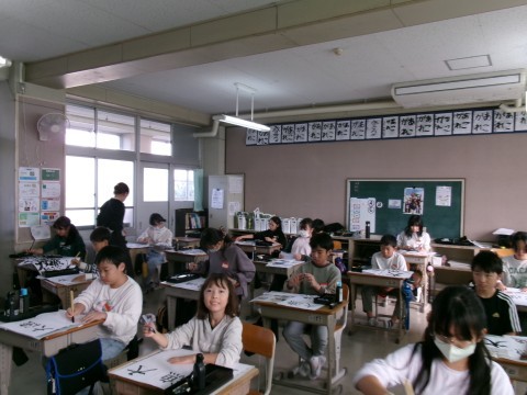 図工の時間に作成した「大漁旗」に「大漁」と筆で書くための練習をしていました。絵は描けたので,「大漁」という字を入れたらいよいよ完成です!