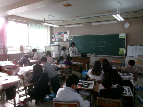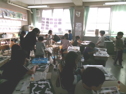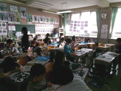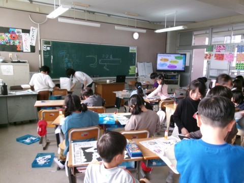 黒と白のコントラストを活かした絵を作っていました。画用紙の上に,黒い紙を切って貼っていきます。子どもたちはいろいろと工夫しながらデザインを考えていました。