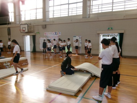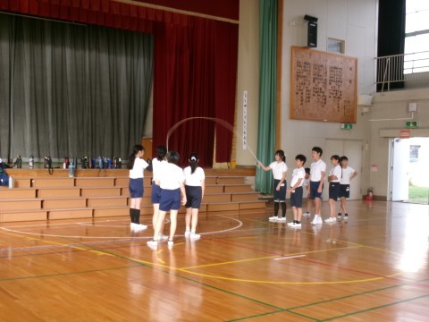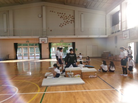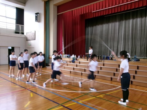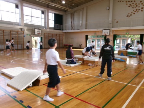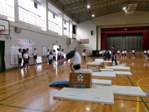 1・2組合同で体育を行っていました。今日は,大縄跳びと跳び箱です。大縄跳びは制限時間内に何回跳べるかを,跳び箱は台上前転の練習をしていました。台上前転は,スモールステップで練習するうちに,だんだん成功する子が増えてきました!