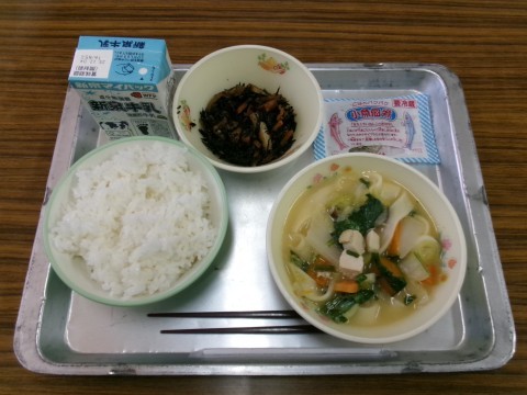 今日のメニューは,ごはん,ほうとう,ひじきのあま煮,小魚の佃煮でした。