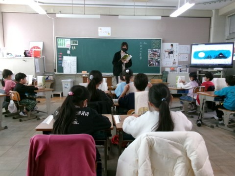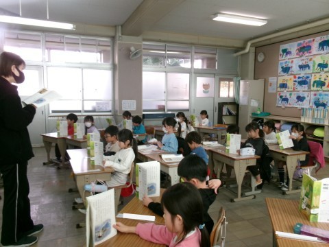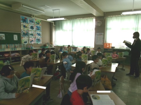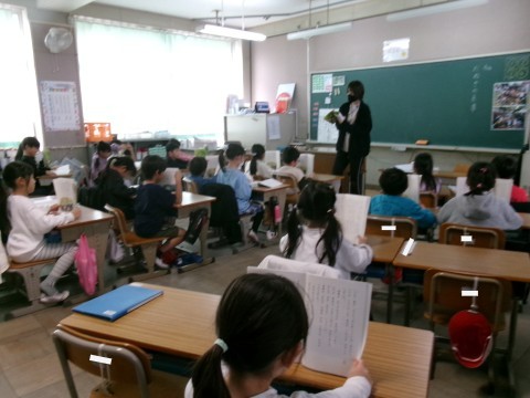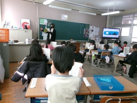「たぬきの糸車」の学習に入っていました。まずは先生が範読して,全員が一生懸命音読していました。
