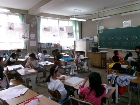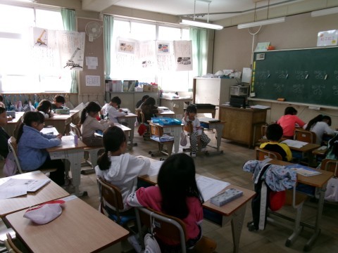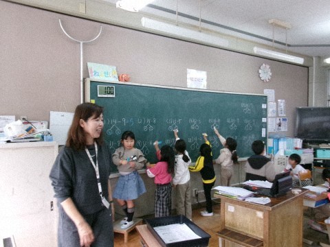 くり下りのあるひき算の復習をしていました。プリントで取り組んだ後,答え合わせで前に出て書いてもらっています。