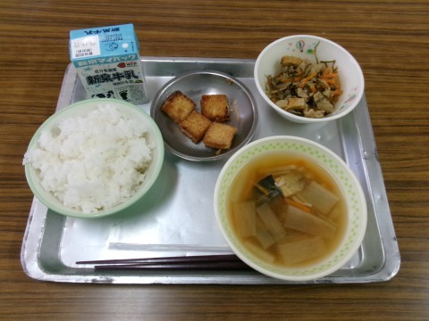 今日のメニューは,ごはん,せんば汁,厚揚げ田楽,海藻きんぴらでした。