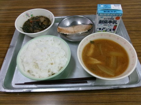 今日のメニューは,ごはん,赤だし,焼き鮭,じゃがいもの磯煮でした。