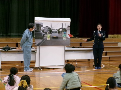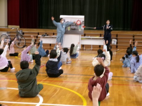 1年生は体育館で,道路を歩くときに気を付けることなどを教えていただきました。