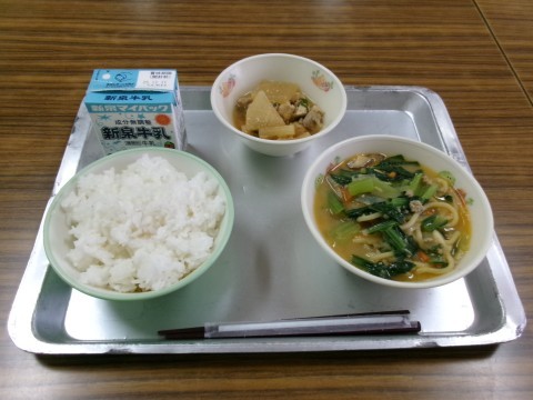 今日のメニューは,ごはん,小松菜タンタン麺,鶏肉の照り煮でした。