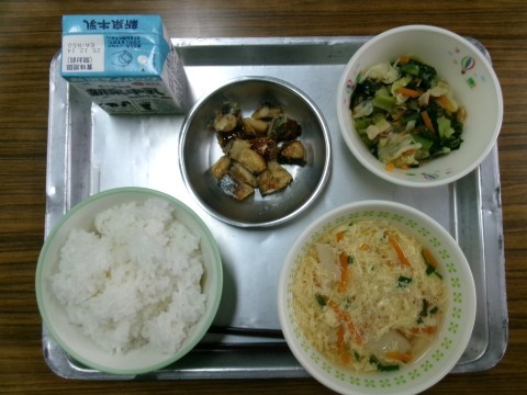 今日のメニューは,ごはん,むらくも汁,さばのごまみそ焼き,キャベツと小松菜の炒め煮でした。