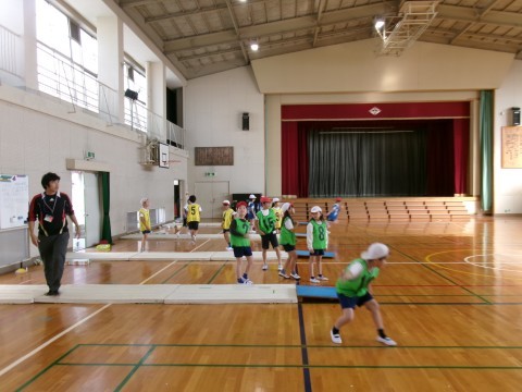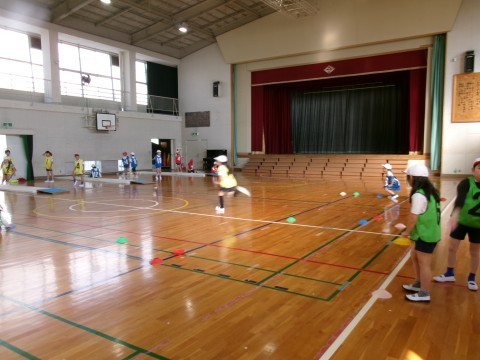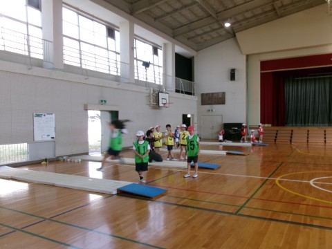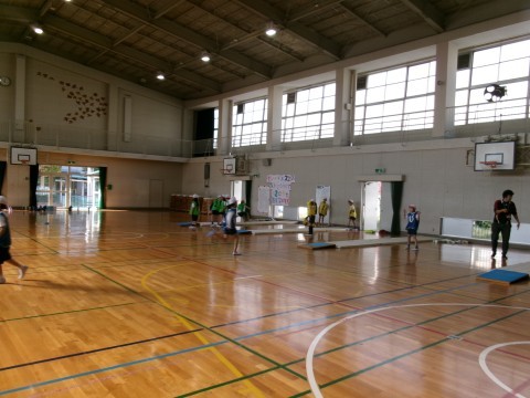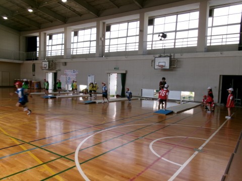 体育館で走り幅跳びの練習をしていました。自分が走ってくるのにちょうどいい位置にマーカーを置いて,タイミングの合う距離を確かめていました。