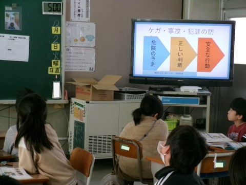 けがや事故,犯罪などにあわないようにするためにはどうしたらよいかについて,考えていました。こうした場面を表している絵を班に1枚ずつ提示し,その危険が起こる環境や人的要因について班で考えていきます。さらに,どうしたら防げるかも考え,それぞれの班で発表をしていきました。