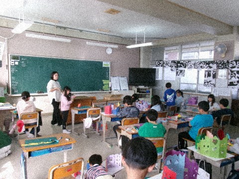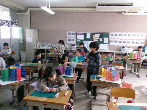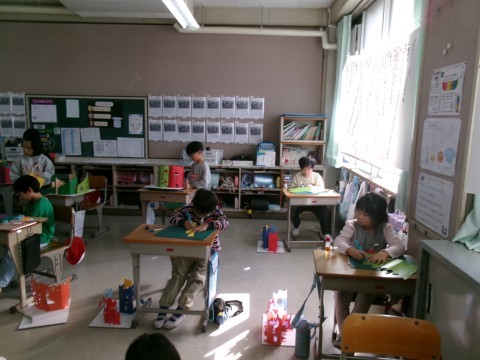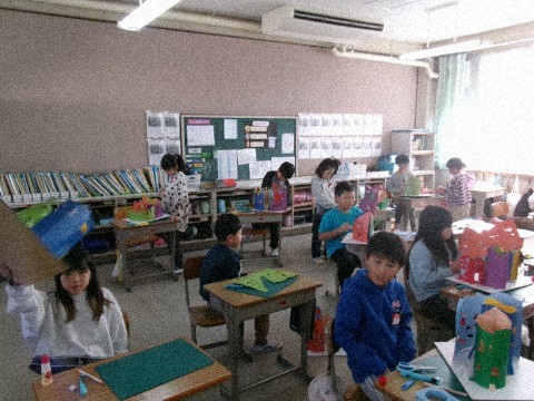 「まどのあるたてもの」を作っていました。カッターナイフを使って,厚紙に切れ目を入れて窓のようにしていきます。もうかなり完成に近づいていました。