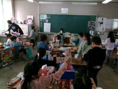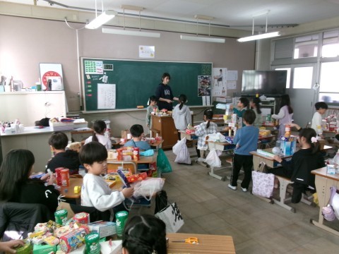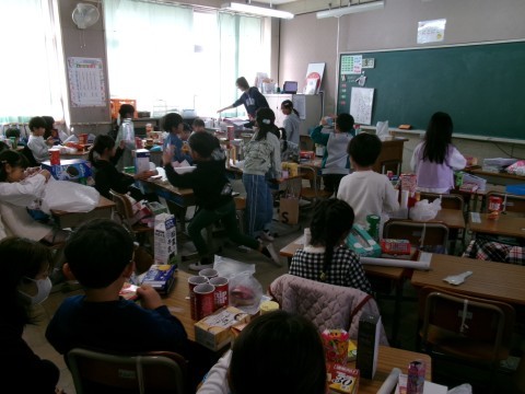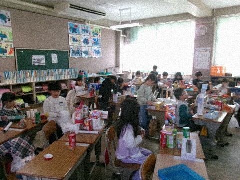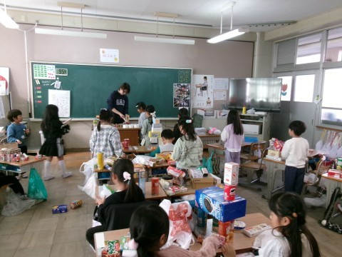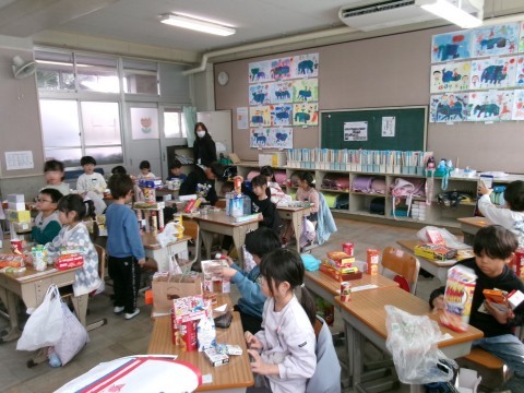 家から持ってきた箱を使って,自分が作りたい物を考えています。まずはテープやのりでとめるのではなく,箱をいろいろ重ねてみて,自分が作りたい物になっているかどうか確かめていました。