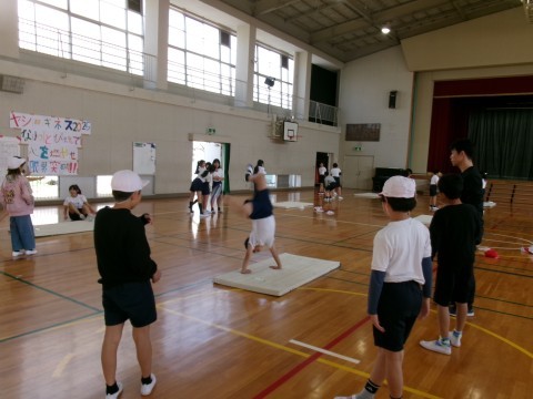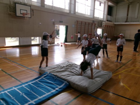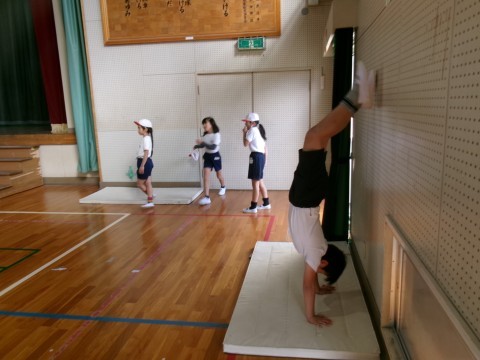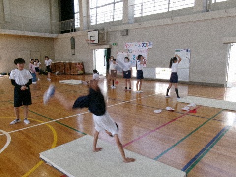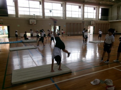 側転や逆上がりの練習をしていました。それぞれが,挑戦しようと思っている種目の場所で,一生懸命練習しています。