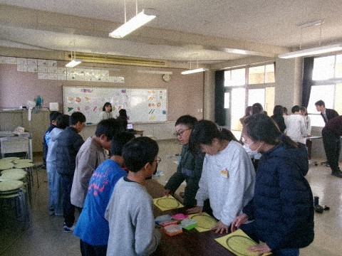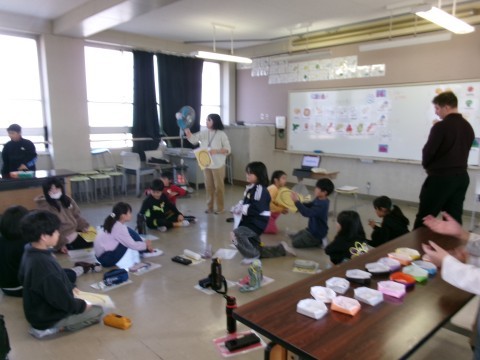 授業は英語活動です。自分が作りたいピザの具材をお店で買うという設定で,英語で「何が欲しいか」「いくつ欲しいか」という2つの内容の受け答えを,店員役とお客さん役になって練習しました。みんな積極的に英語を使いながら会話をすることができていました。