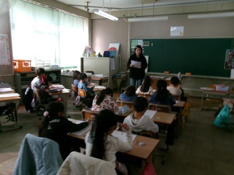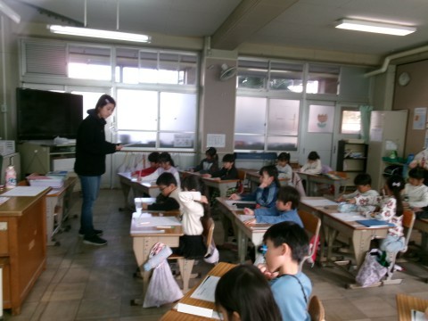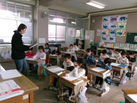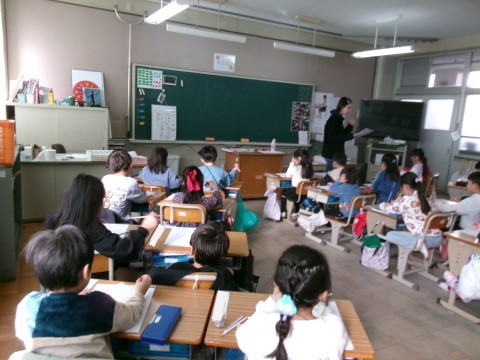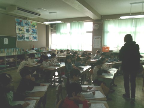 くり上がりのあるたし算のプリントに取り組んでいました。全員がやり終わったら,先生が答えを言って,自分たちで答え合わせをしていました。