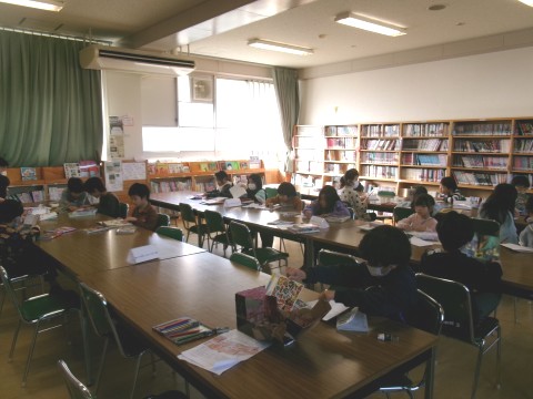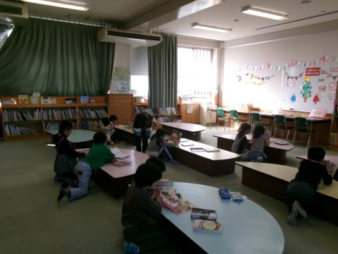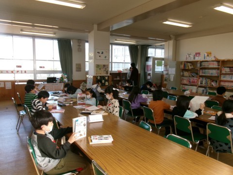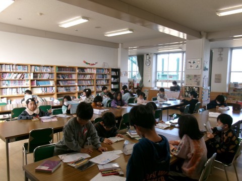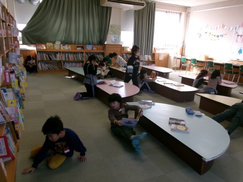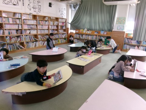 2年生全員が図書室で読書をしていました。テーブルで読んでいる子もいれば,カーペットの部屋で読んでいる子もいました。みんな集中して,静かに読んでいます。