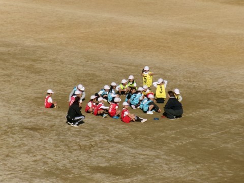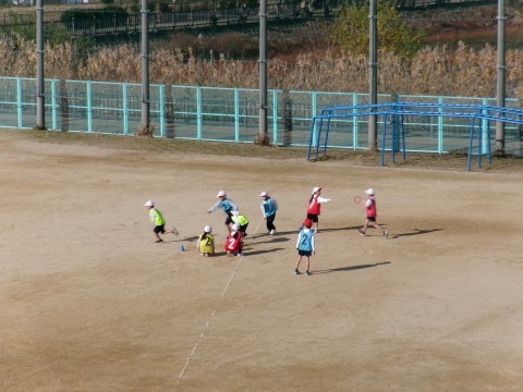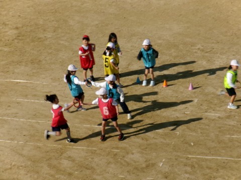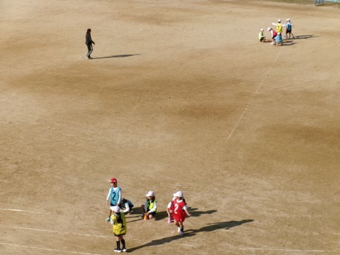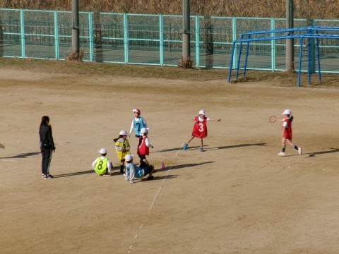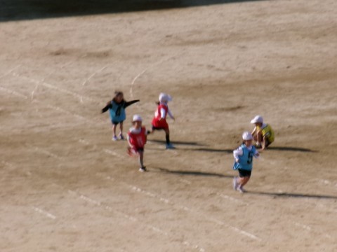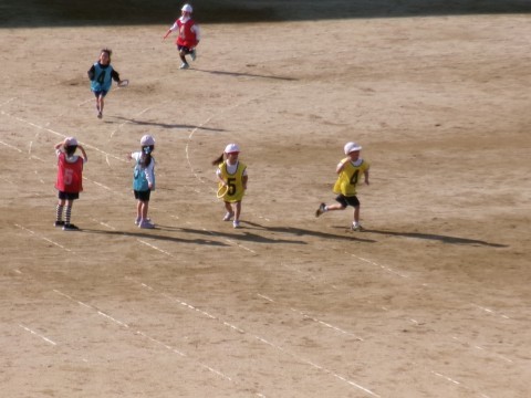 運動場でリレーの練習をしていました。1周を4人で走っていきます。みんな元気に走っていました!
