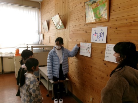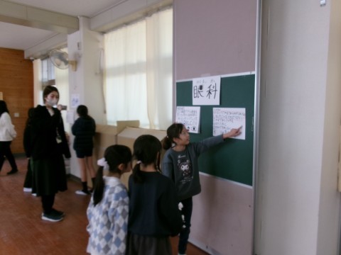 今日の中休みに,「八下西クリニック」というイベントを保健委員会主催で行いました。ランチルームで,健康に関する知識をクイズ形式で出題していきます。歯科や皮膚科,外科,眼科など,その診療科に関係する問題(「子どもの歯は何本あるでしょう?」「目の中にごみが入った時の対応は?」など)を用意していました。今日は1年生と6年生が対象です。