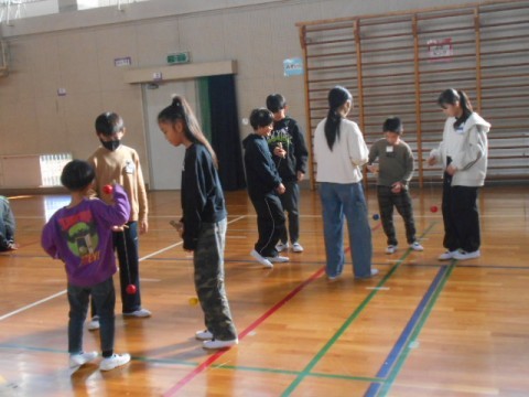 6年生が招待してくれた交流会。チャレンジ学級の友だちの自己紹介の後,4つのブースに分かれて遊びました。1つめは,けん玉ブースです。6年生にコツを教えてもらいながら挑戦しました。なかなか,思うようにできず最初は苦戦していましたが,徐々にお皿に当たるようになりました。お皿に乗せて喜んでいるお友だちもいました。