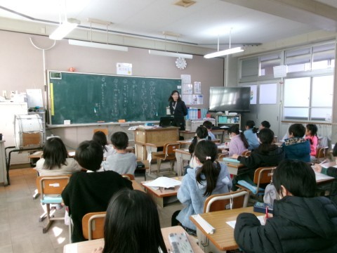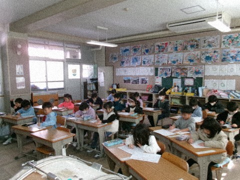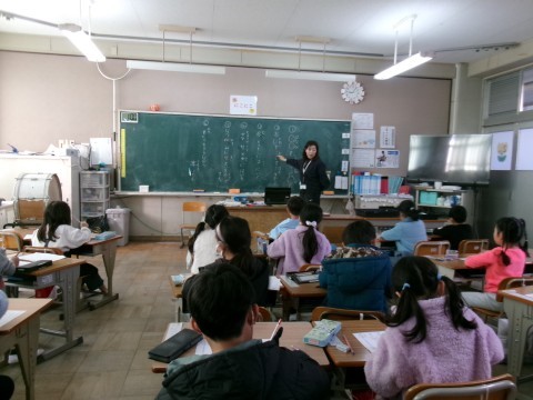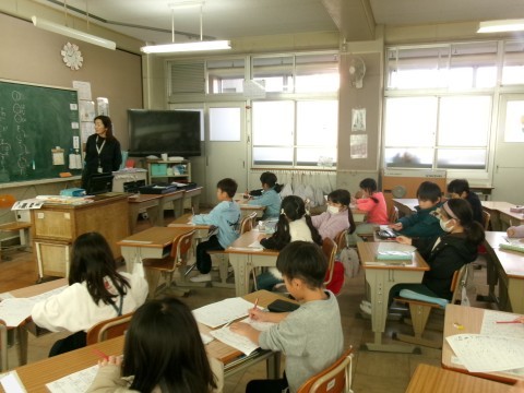 漢字のミニプリントの答え合わせをしていました。子どもたちが黒板に書いてくれた漢字を確かめながら,全員で答え合わせをしています。