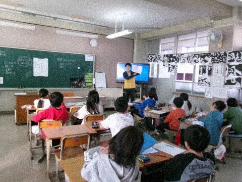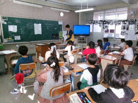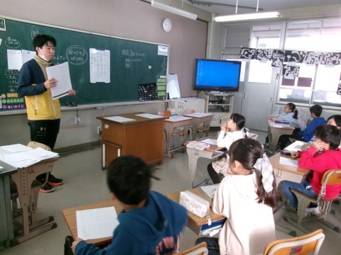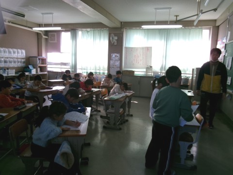 100マス計算をしていました。先生がやり方を説明しています。終わったら,冬休みの宿題のプリントを1枚ずつ取って,冊子にしていました。