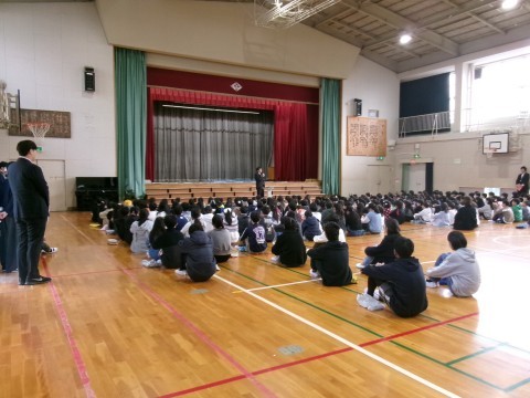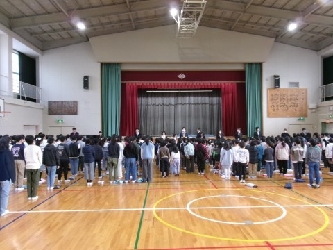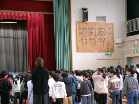 校歌を歌った後,校長先生の話です。体調管理に気をつけることや2学期に頑張ったこと,あゆみについてなどの話をした後,自分たちの周りで支えてくださっているすべての人に感謝の気持ちを伝えて欲しいという内容も話しました。