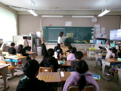 大きい数の表し方を学習していました。10のかたまりのブロックを使いながら,それが8個集まると80になることを確認しています。このブロックを使いながら,30や50などについても考えていました。