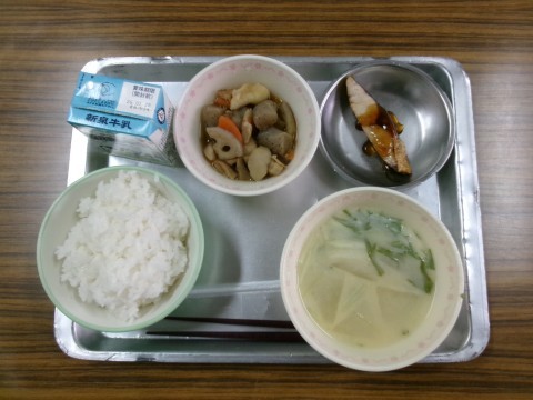 今日のメニューは,ごはん,関西風雑煮,ぶりの照り焼き,にしめでした。今日は正月献立です。
