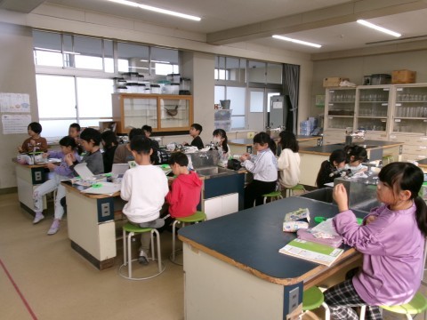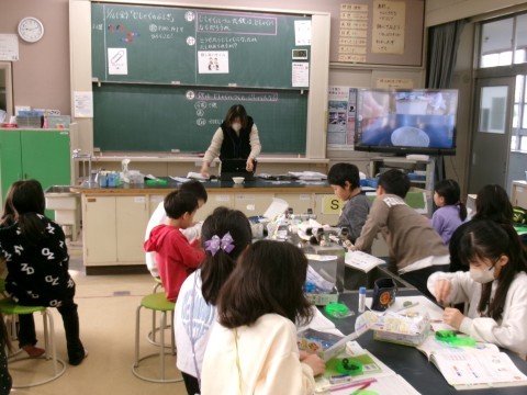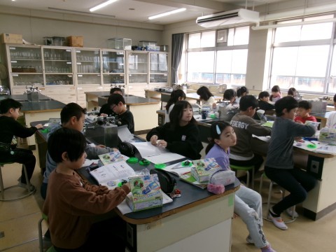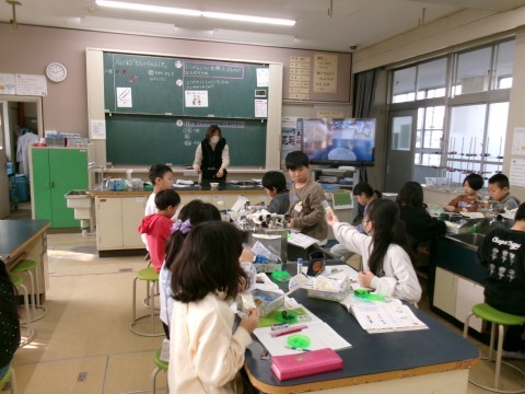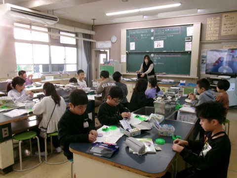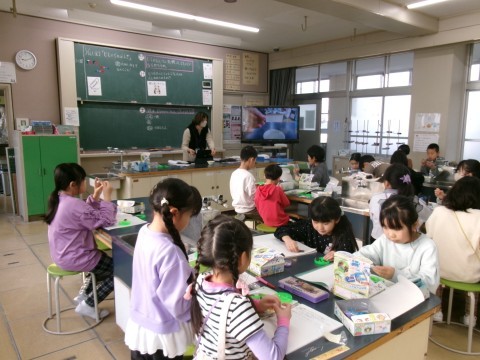 「じしゃくについた鉄はじしゃくになるだろうか?」というめあてで学習を進めていました。じしゃくになることだけでなく,鉄の針を磁石で数回同じ方向にこすると,水に浮かべれば方位磁石の代わりになることも試していました。