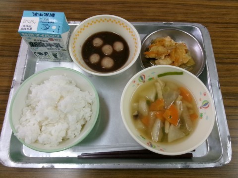 今日のメニューは,ごはん,のっぺい汁,とり唐揚げの野菜あんかけ,白玉ぜんざいでした。今日は「鏡開き献立」です。