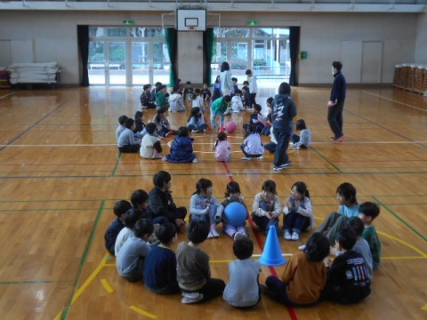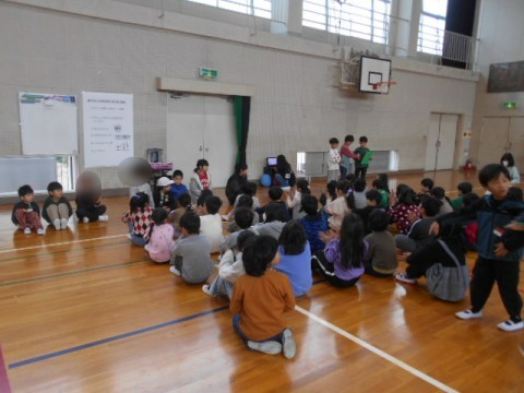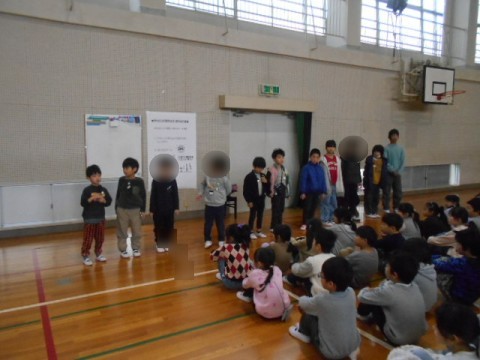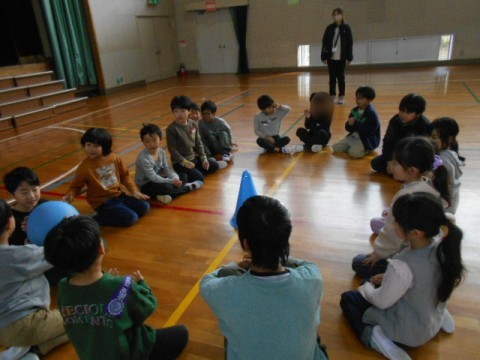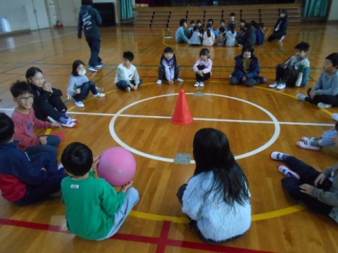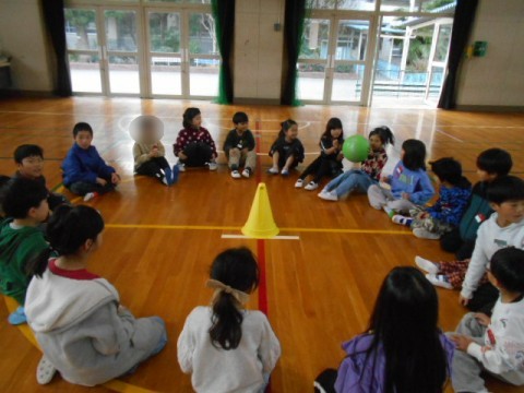 2年生とチャレンジ学級の交流会は,2年生の実行委員3人が司会をしてくれました。交流した遊びは,「ばくだんゲーム」「だるまさんの1日」「じゃんけん列車」です。チャレンジ学級の子どもたちの自己紹介の後,3つのグループに分かれて「ばくだんゲーム」をしました。音楽に合わせてばくだんに見立てたボールを回していきます。ボールが止まった人は,自己紹介をしました。音楽が止まるたびに,どのグループもテンションがあがっていました♪