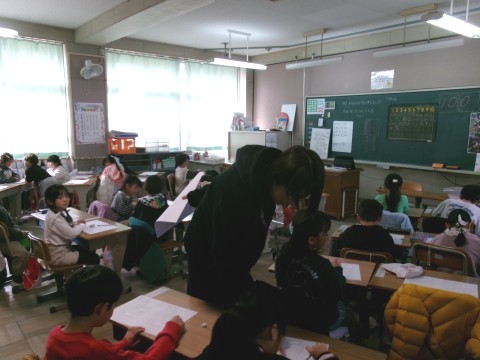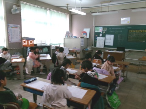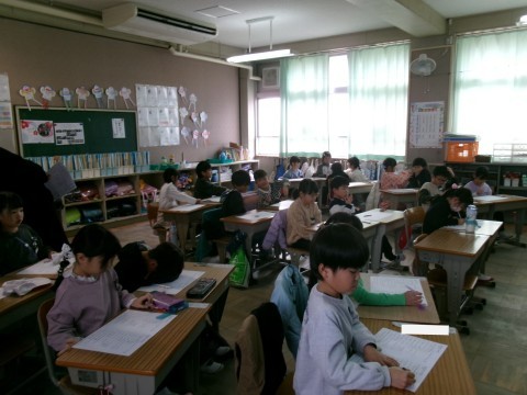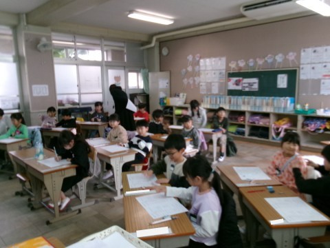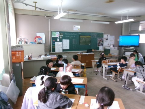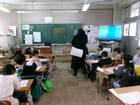 「おちばのかずをかぞえましょう」という問題に取り組んでいました。大きい数をどのように数えるとよいかというものです。十の位と一の位という概念や,10が10個で100になるということを確かめていました。その後,練習問題のプリントに挑戦していました。
