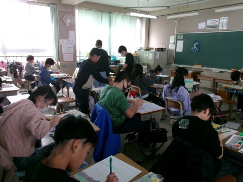 クレパスで下絵を描いて,その上から絵の具を塗っていました。きれいな模様をつけた下絵に,集中して色を塗っています。もうすぐ完成なので,どのような絵ができるか楽しみです♪