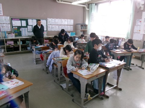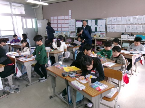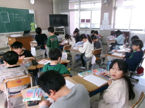 自分たちが考えた本の表紙を作っていました。お気に入りの絵を描いて,それに色を塗っていきます。完成が楽しみです!