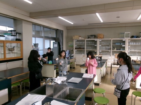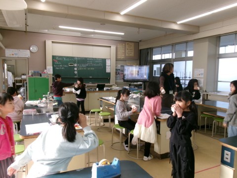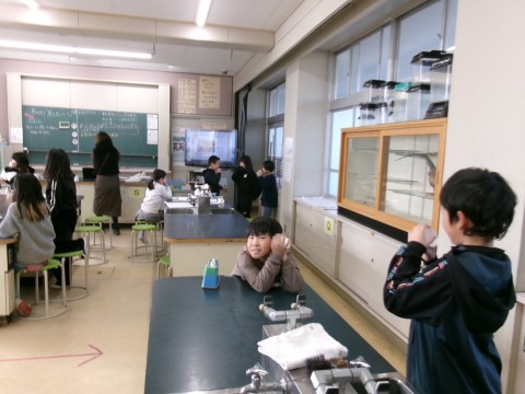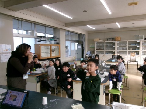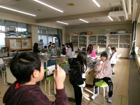 糸電話の実験をしていました。糸をピンと張ることに注意しながら,先生からもらった紙に書いてある言葉を班のみんなに順番に伝えていきます。音の伝わり方を,楽しみながら学習することができました!
