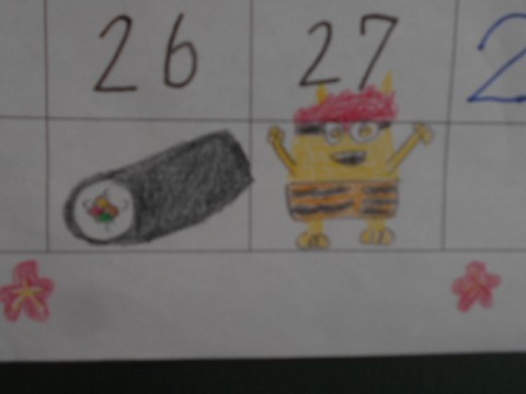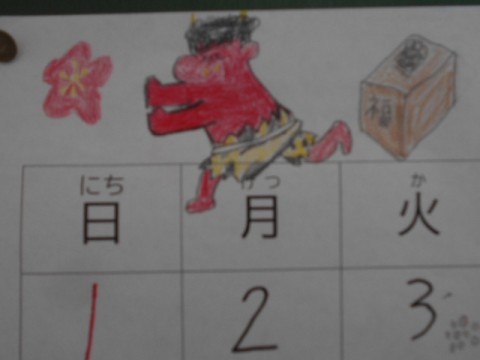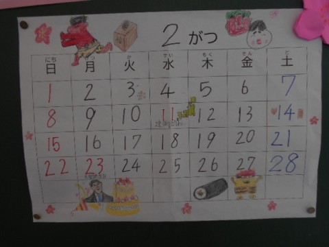 2月に入りました!チャレンジ2の掲示です♪明日は節分ですね!折り紙で色とりどりの鬼を折って飾っています。カレンダーには,豆まきから逃げる鬼や可愛いキャラクターの鬼,天皇陛下の絵など工夫を凝らしたカレンダーに仕上がりました。2月も寒さに負けず元気に頑張りましょう!