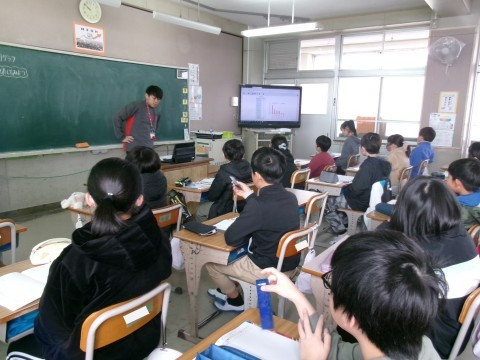 「割合をグラフで表してみよう」というめあてで学習を進めていました。まず最初に,これまで学習してきた棒グラフや折れ線グラフの確認をしていきました。それから,帯グラフの学習に入っていきます。
