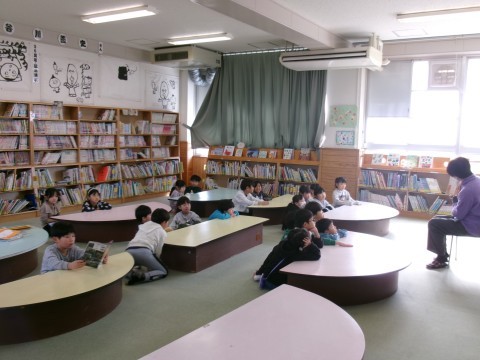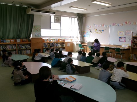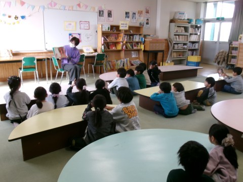 読書の時間の様子です。今日は,司書の方に絵本の読み聞かせをしてもらっていました。みんな一生懸命お話を聞いています!