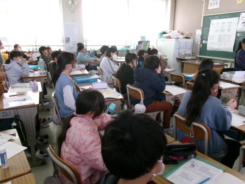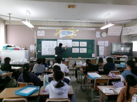 変わった形の図形の面積の求め方を考えていました。2つに分けてからそれぞれの面積をたしたり,1つの長方形と考えて全体の面積を出し,後から実際にはない部分の面積を引いたりして求めていきます。それだけでなく,出っ張った部分の一部の長方形を移動して一つの長方形にして計算するなど,いろいろな方法を考えることができました!