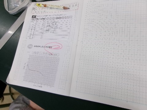 昨日の実験の結果を班のみんなで共有し,グラフを描いたものを持ち寄りました。
