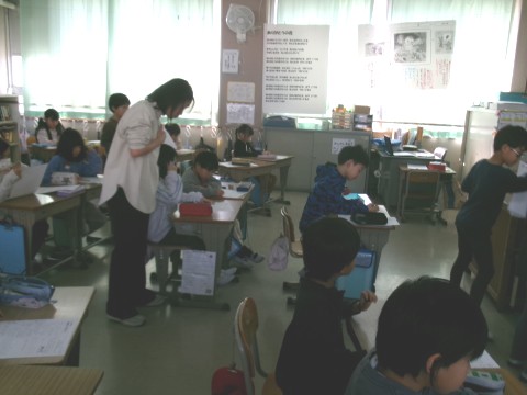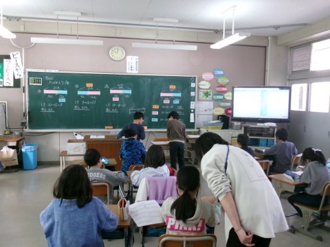 「図をつかって考えよう」という単元の復習プリントに挑戦していました。プリントを行う前に,図を使って考える問題をいくつか一緒に考えてから取り掛かっています。