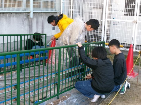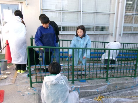 写真は,6年生の卒業委員によるボランティア活動の様子です。スロープにある柵のさびを落として,ペンキを塗っています。