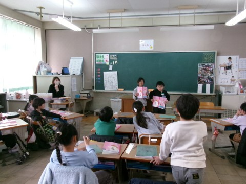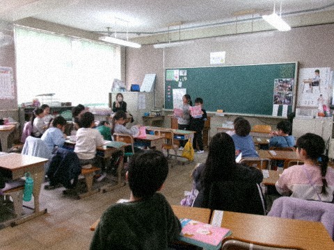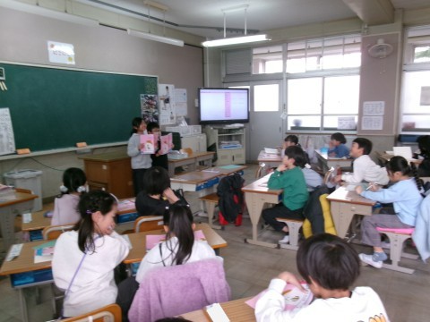 3ヒントクイズ(実際には答えが出ないことも考えて,あと2つ位ヒントを考えていました)を行っていました。ペアで考えた問題を,前に出て出題していきます。
