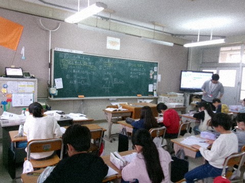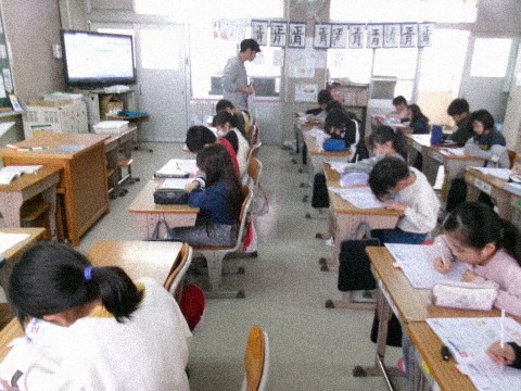□を使った「かけ算」の学習をしていました。もとになる数を求めるには「わり算」を使う必要があるのですが,□を使ったかけ算の式で表してから考えると分かりやすいということを確かめていました。写真は,まとめが終わってワークで練習問題に取り組んでいるところです。