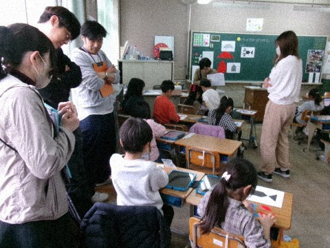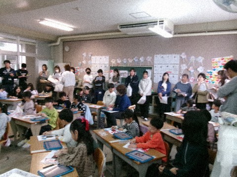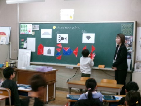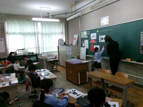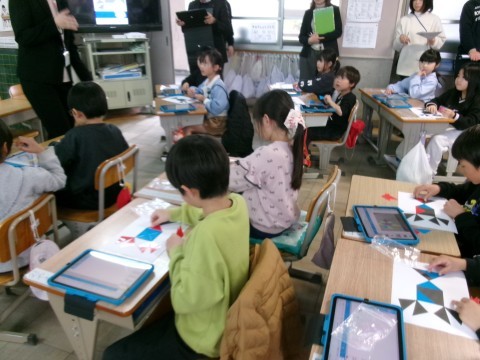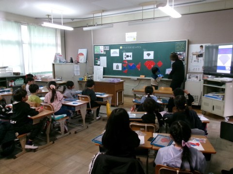 今日は算数の研究授業でした。子どもたちは本当に一生懸命学習に取り組んでいました。三角形を何枚か組み合わせて色んな形を作っていく授業です。本校の先生だけでなく,架け橋プログラムの一環として3つの幼稚園等の先生方も参観に来てもらいました。幼稚園の先生方は,子どもたちの成長に驚くとともに,とても喜んでくれていました。