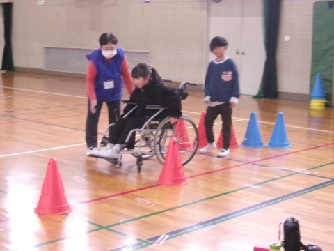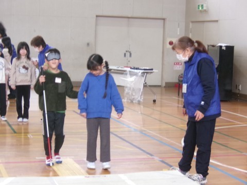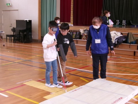 キャップハンディさかいのみなさんに来ていただき,体育館で視覚障害体験,下肢障害体験,聴覚障害体験をしました。