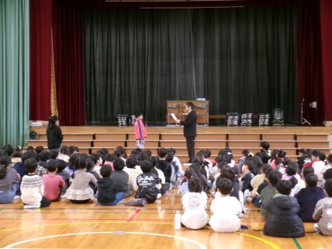今日は全校朝礼でした。校歌を歌った後は,校長先生の話です。今日は「年と年度の違い」について話がありました。次に,担当の先生から今月の生活目標についての話がありました。