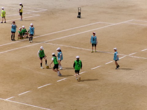 今日はラインサッカーの試合をしていました。最初にチームごとに練習をして,その後実際に試合をしていきます。楽しみながらも,しっかり運動量もキープして運動することができました。