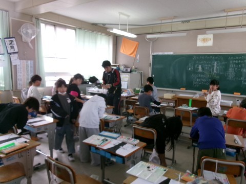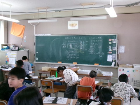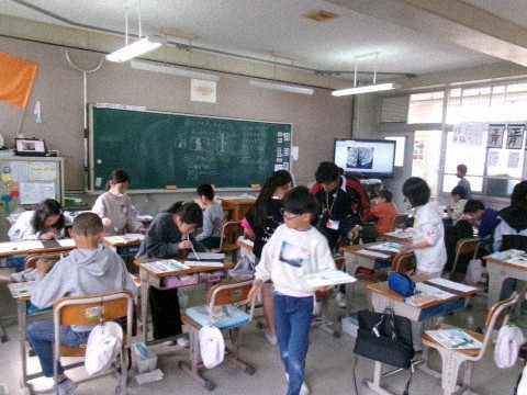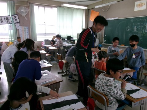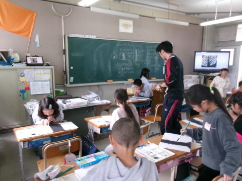 国語の教材でもある「モチモチの木」の絵を描いていました。モチモチの木の独特な雰囲気を出すために,太い幹を描いた後,絵の具を水で薄めたものを画用紙にたらして,それをストローで吹くことで枝を表していきます。手で描くよりも,どんな形の枝になるか分からないので,子どもたちはわくわくしながら制作に取り組んでいました!